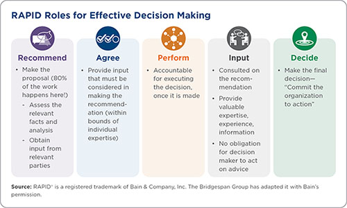 In every nonprofit larger than a conference room, decision making gets harder, slower, and messier over time. The RAPID® decision-making tool can help clean up your process by clarifying who should be involved in making decisions and what roles they should play.