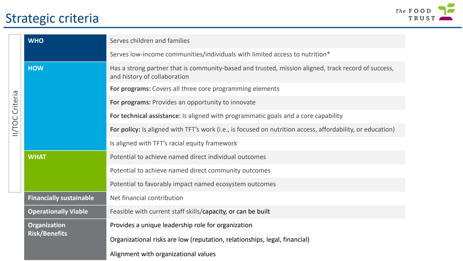 Decision criteria aren’t just an internal tool. They can help nonprofits communicate a consistent story externally, especially when shifting organization priorities or declining opportunities. Huffman noted that sharing decision criteria can deepen strategic conversations with funders beyond a single “yes/no” decision, enabling them to show how their strategic thinking is evolving and what they plan to do: “It’s engaged funders in a richer conversation about our work and about what our theory of change is,” he shared.
