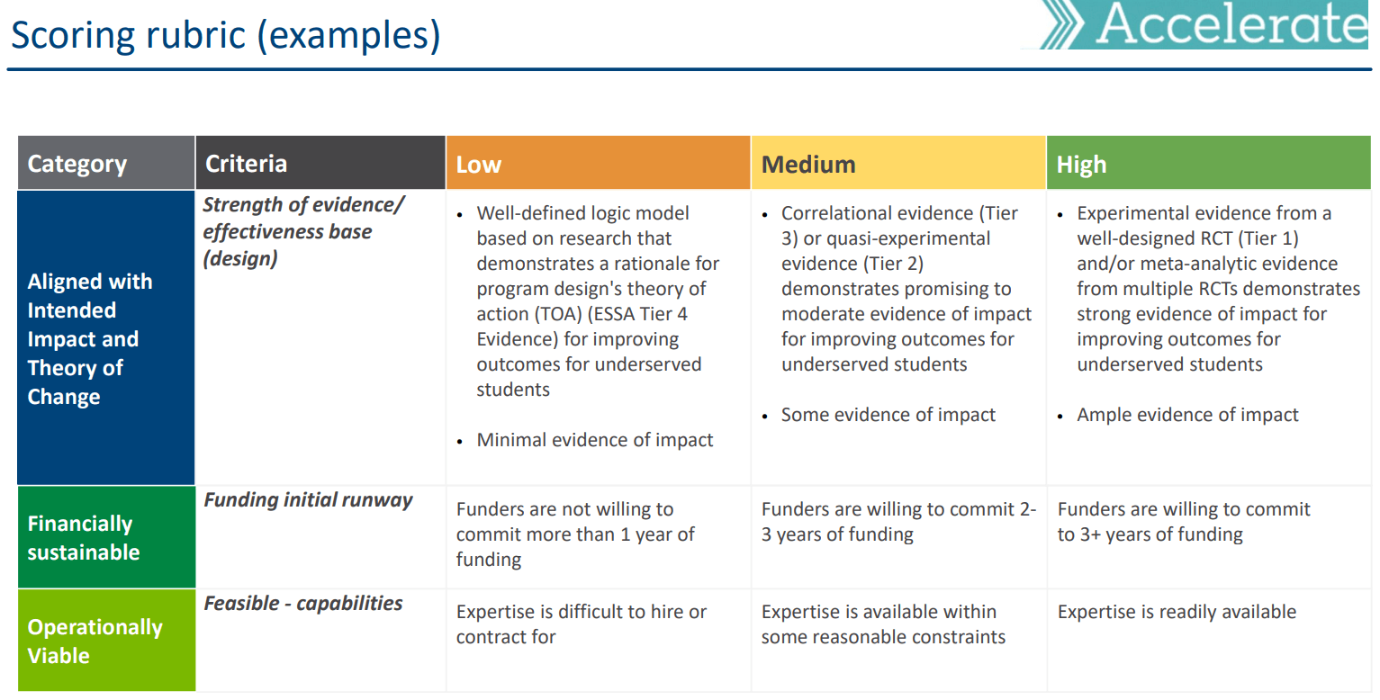 In this example from CEO Kevin Huffman of Accelerate, the rubric helps clarify whether an opportunity is weak, moderate, or excellent against his organization's decision criteria. (Click to enlarge)