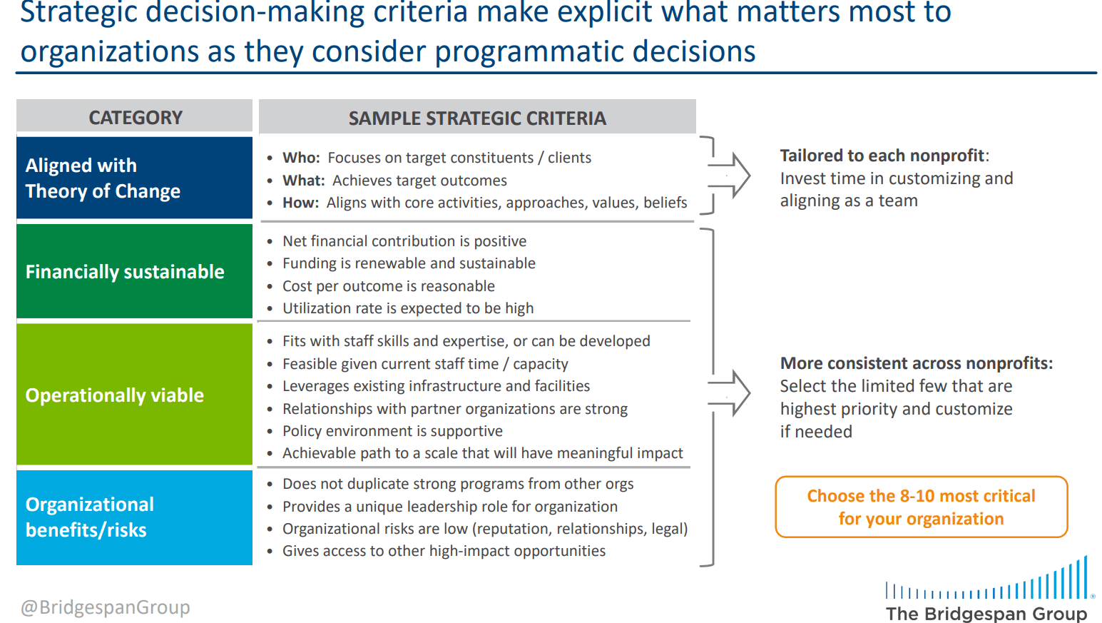 The Bridgespan Group has previously written about how to develop decision-making criteria for making strategic decisions. In this article, we focus on the next steps: how to use those decision criteria as a practical tool, rather than a one-time exercise.
